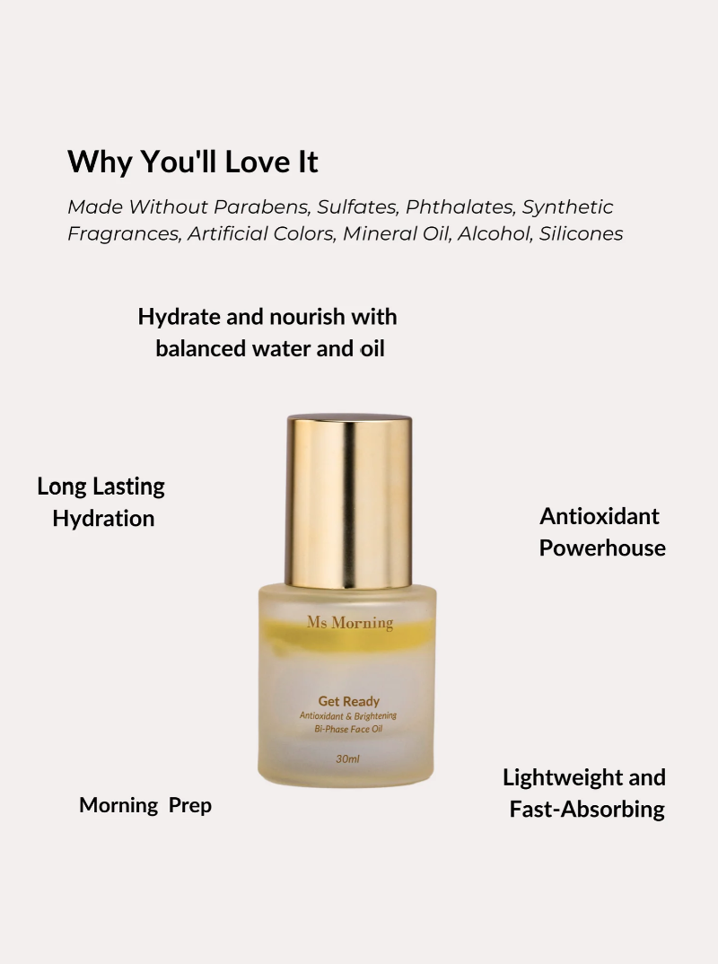 The Get Ready Bi-Phase Face Oil is your perfect ally for the morning, offering a quick, effective, and non-burdensome addition to your skincare routine. Just one step in the morning ensures your skin is ready to face the day with a radiant and healthy look. In our fast-paced lives, the Get Ready Bi-Phase Face Oil stands out as an essential morning companion, embodying not just skincare but a lifestyle choice towards healthier, more radiant skin.